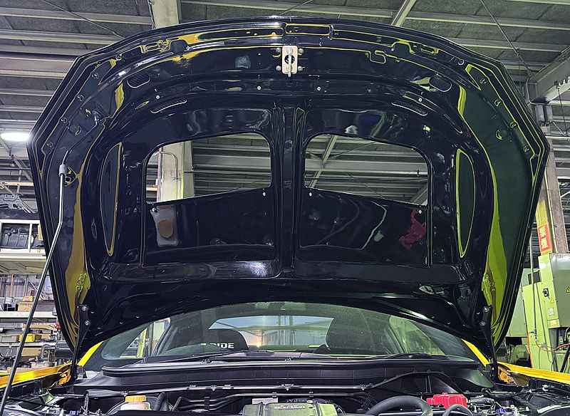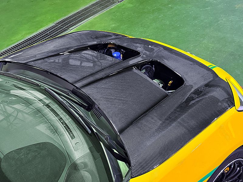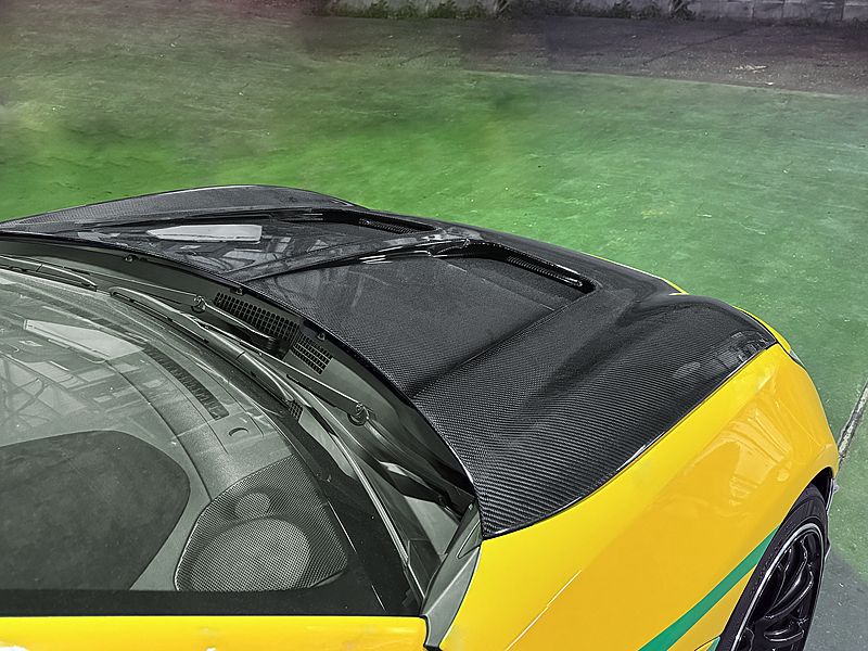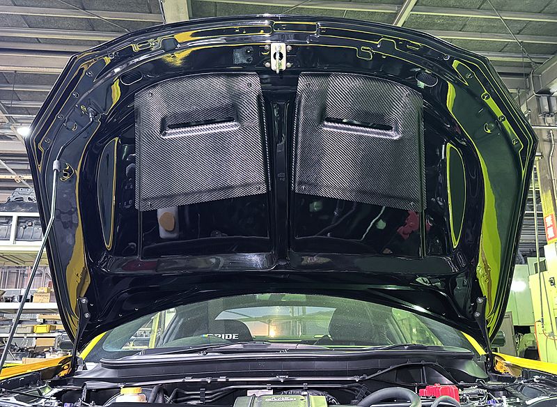 純正形状のオールカーボン製です。アウターはもちろん、インナーパネルまでCFRPで製作しているため非常に軽量で、純正ボンネット(約8.6kg)よりも 3kg以上軽量化されています。
