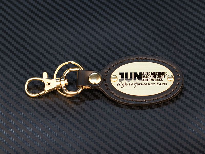 このキーホルダーは、黒く染めた本革(日本製)に金属のプレートを取り付け、JUNのロゴをあしらったものです。